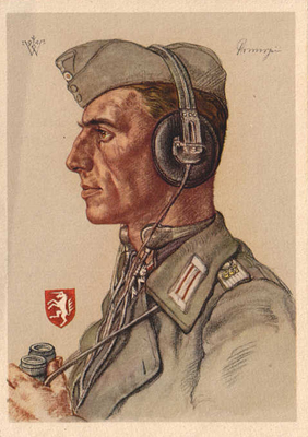 On the 14th of September 1939 Willrich wrote to Rommel (whom he had come to know through Pauk Linke in 1938, and had already painted) suggesting that he be sent to the front as a combat artist. His petition was supported by officials of the VDA, who helped see to it that he was allowed to draw without restriction. He was commissioned to portray the most important leaders of the German Armed Forces, choosing as his first works U-Boat people and leaders of the German Navy (Karl Doenitz, Guenter Prien, Schuhart, Schulze, and so forth) which were featured in an exhibit at the Berlin House of Artists´ called "Campaign in Poland-The U-Boat War in Pictures and Portraits". It was a complete success, and he was assigned the rank of Feldwebel. He then took part in the campaign in France alongside units of the Wehrmacht, and made portraits of Rommel and General Guderian. Willrich also spent time with the Fallschirmjaeger of the Koch Assault Unit. Until March of 1941 he belonged to the Wehrmacht Press Division, led by Oberst Hesse, but was eventually sent to Norway and Finnland, where he visited units of the Mountain Troops and Organization Todt (1941-42); later he spent time with General Kesselring in Sicily (1943), and then found himself in Russia. He made countless portraits during this period- anonymous soldiers as well as famous personalities like Hans-Ulrich Rudel, Anna Reitsch, Moelders, Gallant, Goering, Dietel , Ferdinand Schoerner, and others In 1941 the National Socialist Cultural Authority presented an exhibit of his work called "Race and Nation". In addition, in 1942, he was given the task of painting the portraits of holders of the Knights Cross. His work was published in series by the VDA, including some of it as the postcards that are so widely sought after by collectors today. On the 19th of July, 1942 he was named Sonderfuehrer, but was of the opinion that the promotion would only serve to hamper his freedom, and had it reversed by December. At the end of 1943 he returned to Berlin-Frohenau, where he continued his artistic activity. His last book Soldiers of the Reich appeared during this time. In 1944 the Oberkommando des Heeres assigned him the new theme of "That's Why the German Soldier Fought", which, because of the German defeat, only appeared under that title as a book in Buenos Aires in 1949. In 1945 Willrich was taken prisoner by the Americans and interned in a camp at Normandy, where his health deteriorated. Undernourished and sick, he was transferred to an American military hospital at the end of 1945, and in 1946, released.